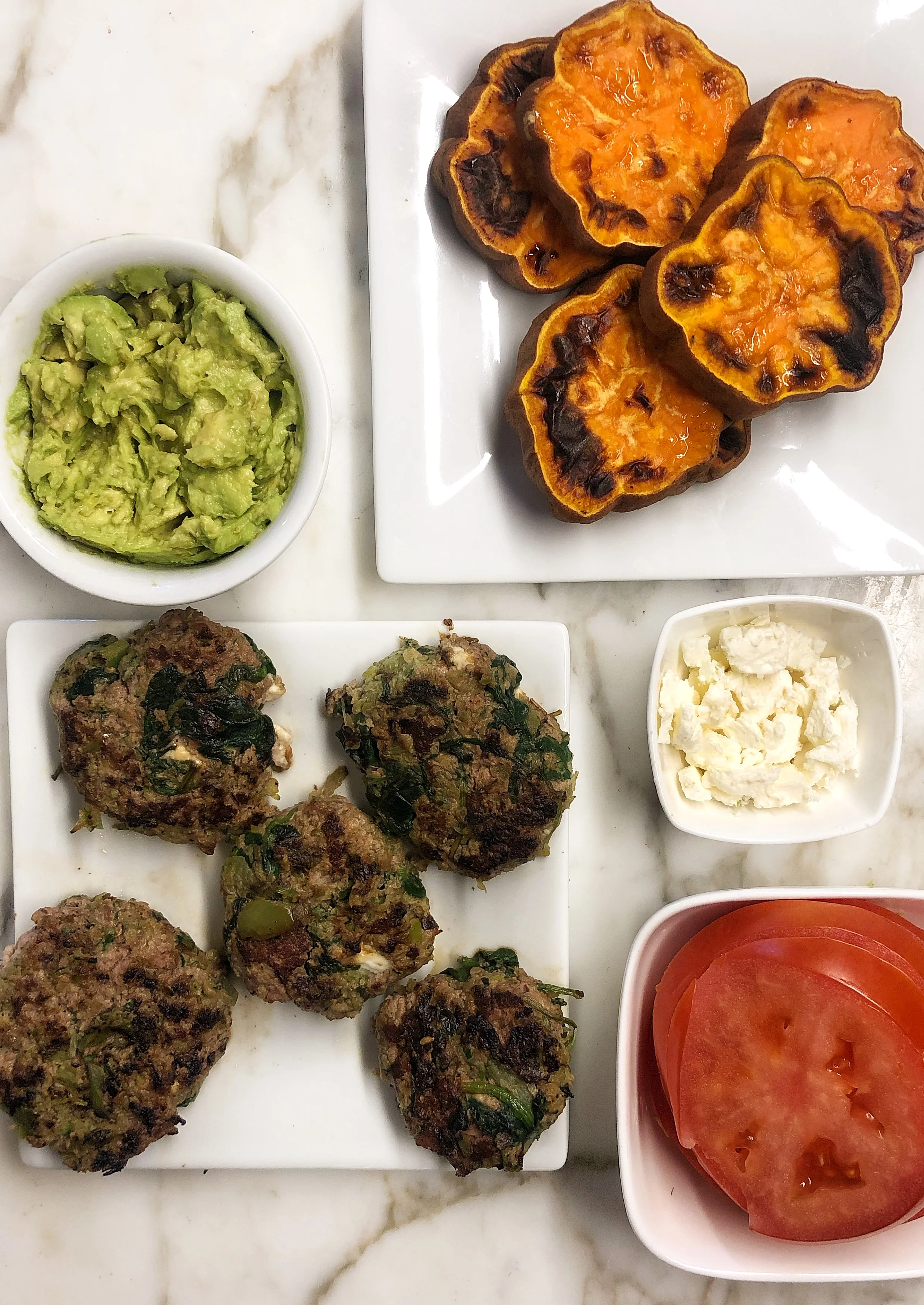 Using the sweet potato as a bun, layer one side with avocado mash, diced tomato, and the lamb slider, and then top with another sweet potato disk